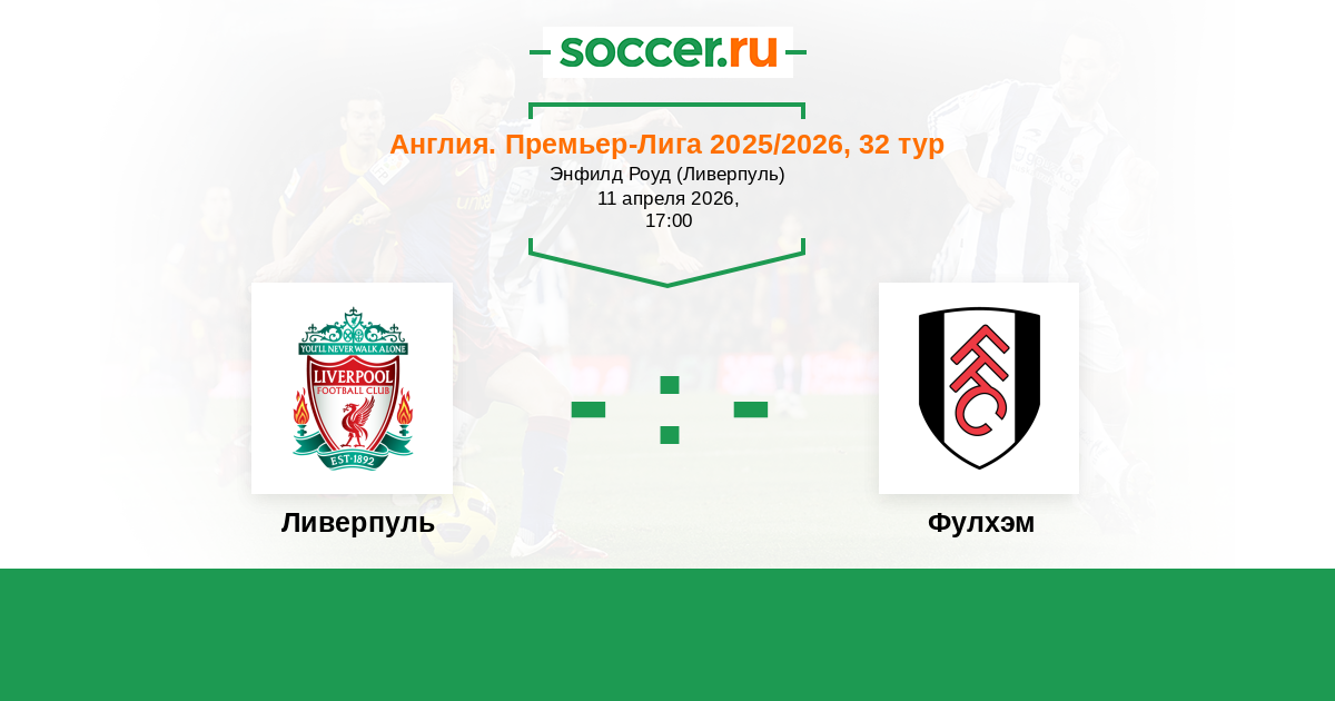 Англия. Премьер-Лига 11.04.2010 Ливерпуль Логотип футбольный клуб Ливерпуль 0:0 Логотип футбольный клуб Фулхэм (Лондон) Фулхэм