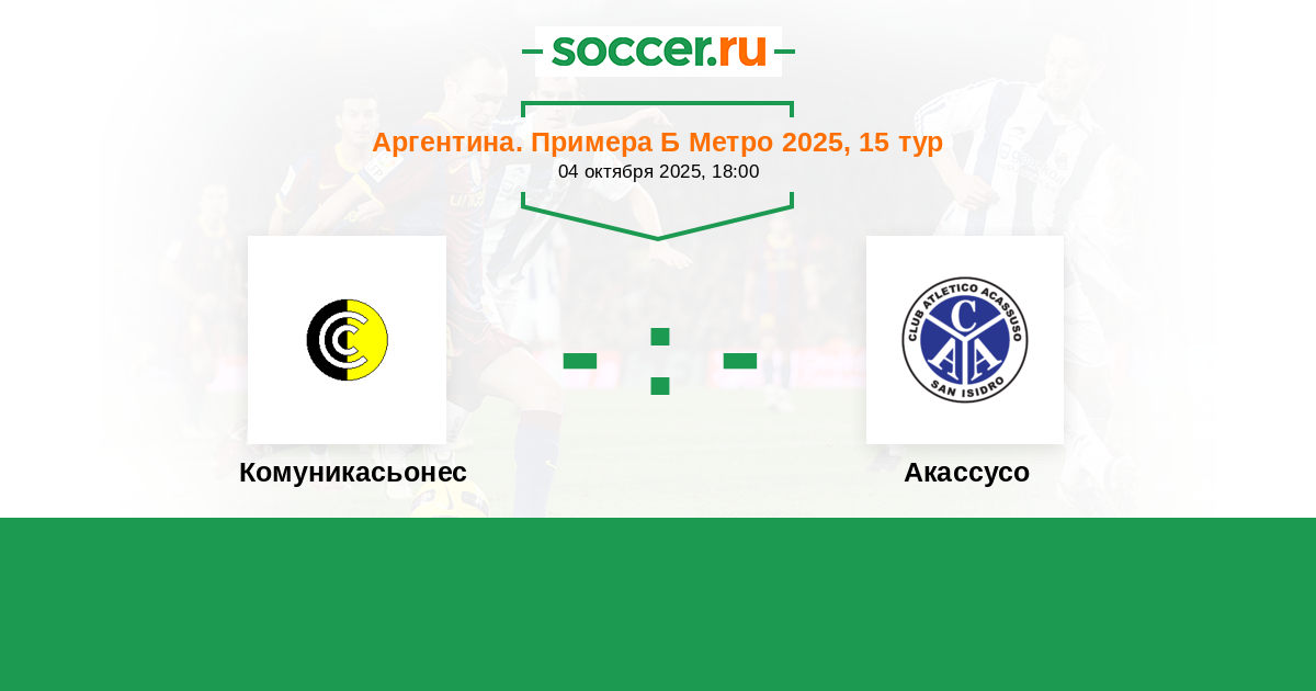 Аргентина. Примера Б Метро 01.11.2024 Акассусо Логотип футбольный клуб Акассусо (Сан-Исидро) 0:2 Логотип футбольный клуб Комуникасьонес (Буэнос-Айрес) Комуникасьонес