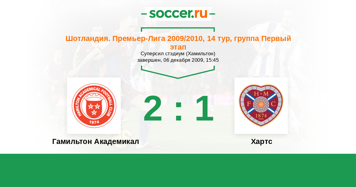 Шотландия. Премьер-Лига 21.02.2010 Хартс Логотип футбольный клуб Хартс (Эдинбург) 2:0 Логотип футбольный клуб Гамильтон Академикал Гамильтон Академикал