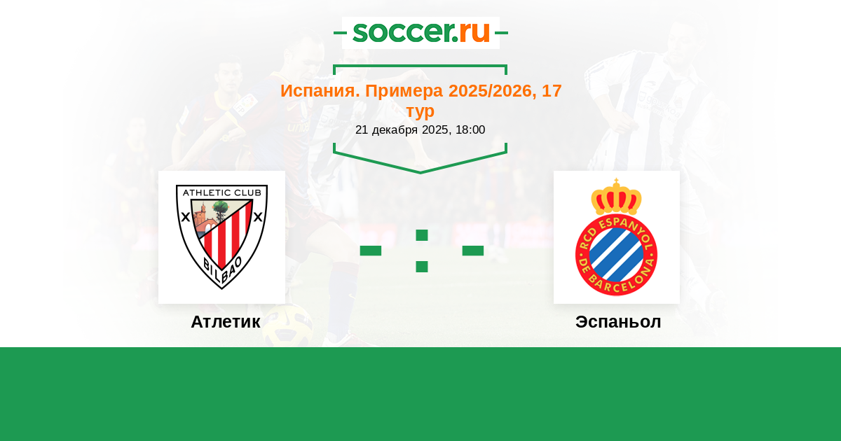 Атлетик - Эспаньол ! Оба клуба довольно не плохо выступают в нынешнем первенстве , а гости так и вообще имеют хорошую победную серию . Предположу по крайней мере обмен голами .