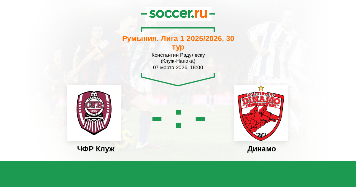 Румыния. Лига 1 15.03.2025 ЧФР Клуж Логотип футбольный клуб ЧФР Клуж (Бухарест) 3:1 Логотип футбольный клуб Динамо (Бухарест) Динамо