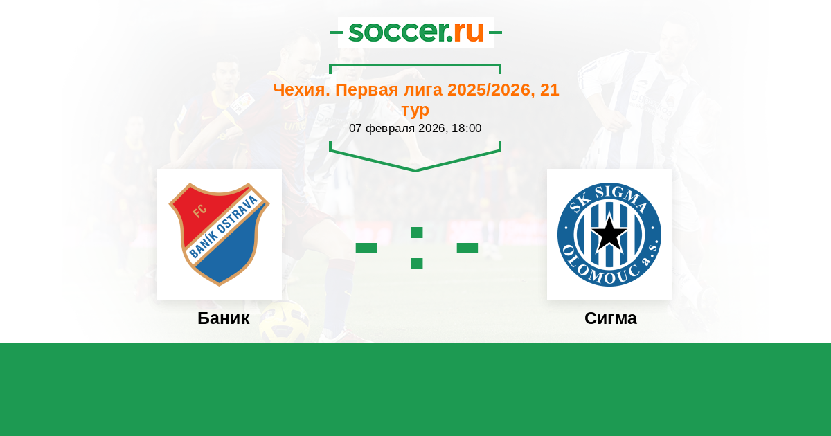 Чехия. Первая Лига 19.02.2022 Баник Логотип футбольный клуб Баник (Острава) 1:0 Логотип футбольный клуб Сигма (Оломоуц) Сигма