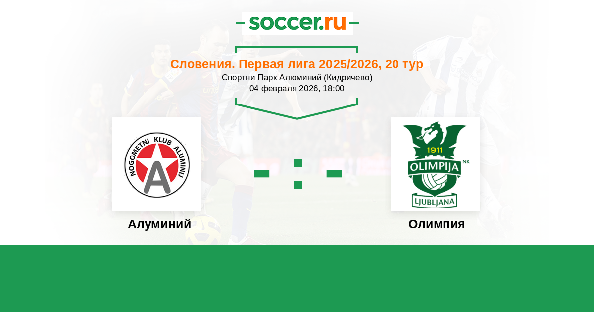 Словения. Первая Лига 21.02.2021 Алуминий Логотип футбольный клуб Алуминий (Кидричево) 0:0 Логотип футбольный клуб Олимпия (Любляна) Олимпия