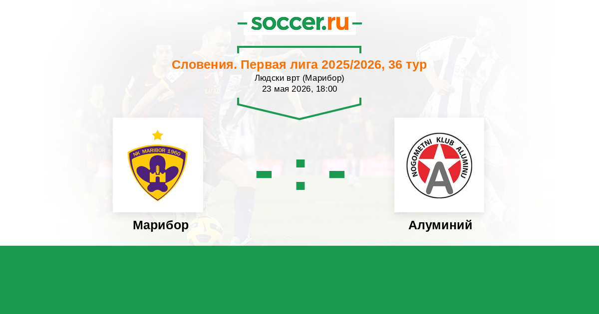 Словения. Первая Лига 16.04.2021 Алуминий Логотип футбольный клуб Алуминий (Кидричево) 0:0 Логотип футбольный клуб Марибор Марибор