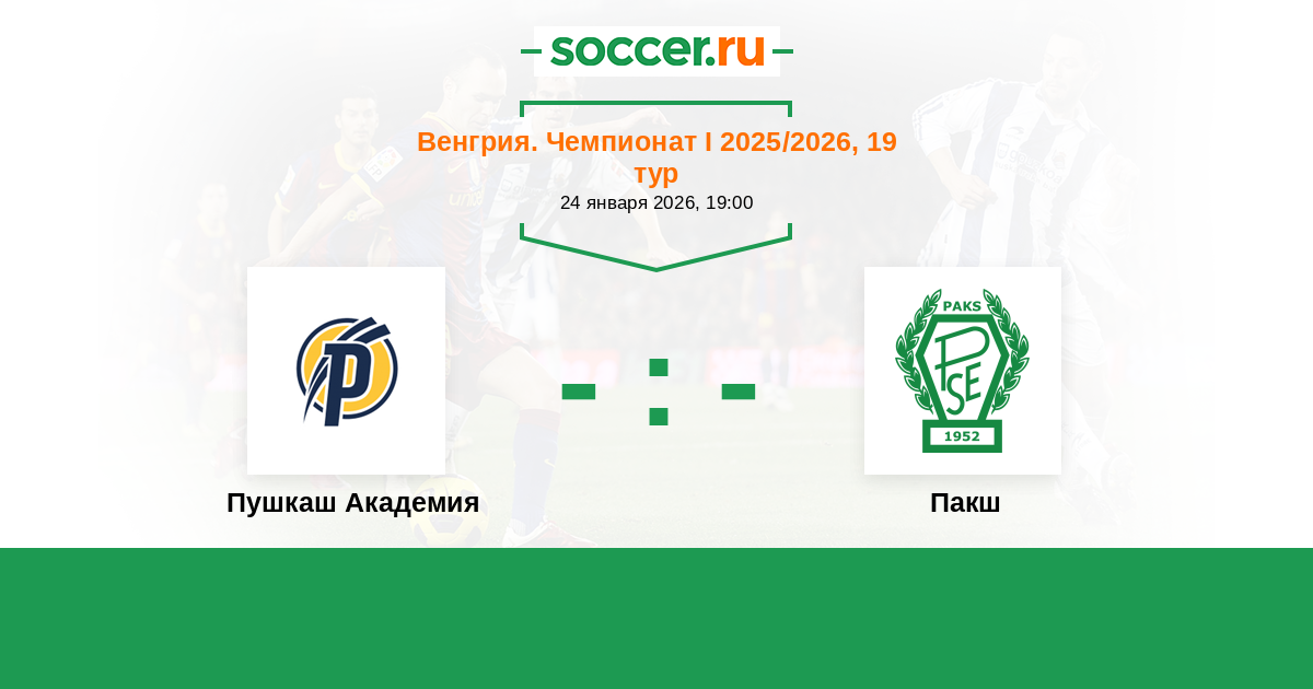 Венгрия. Чемпионат 1 19.10.2019 Пушкаш Академия Логотип футбольный клуб Пушкаш Академия (Фелксут) 4:2 Логотип футбольный клуб Пакш Пакш