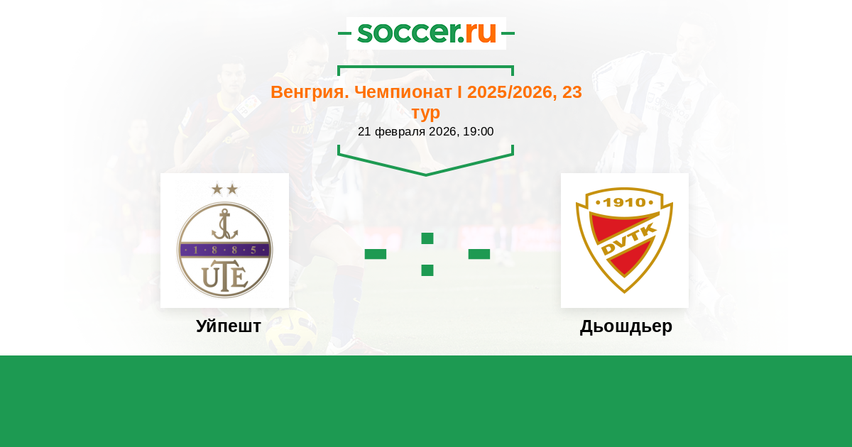 Венгрия. Чемпионат 1 23.02.2019 Уйпешт Логотип футбольный клуб Уйпешт (Будапешт) 5:0 Логотип футбольный клуб Дьошдьер (Мишкольц) Дьошдьер