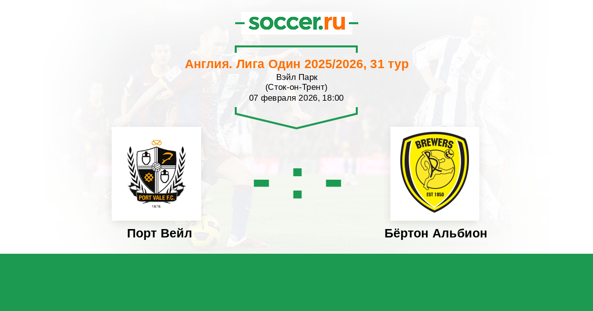 Англия. Первая Футбольная Лига 18.03.2023 Порт Вейл Логотип футбольный клуб Порт Вейл (Сток-он-Трент) 2:3 Логотип футбольный клуб Бёртон Альбион (Бёртон-апон-Трент) Бёртон Альбион