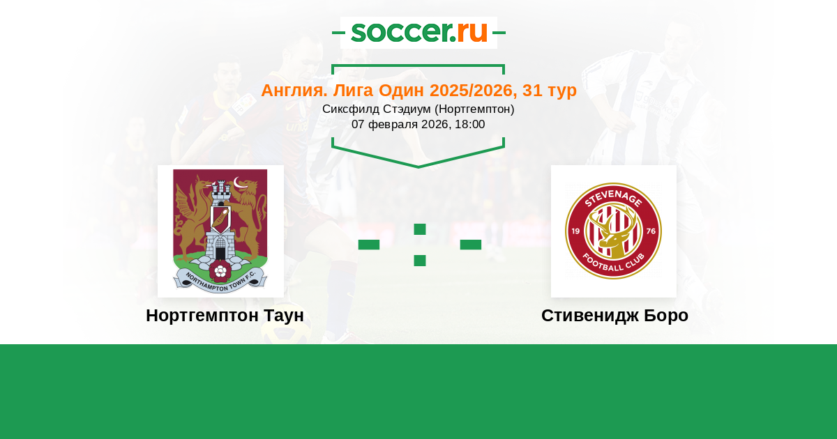 Англия. Первая Футбольная Лига 01.01.2025 Нортгемптон Таун Логотип футбольный клуб Нортгемптон Таун 0:0 Логотип футбольный клуб Стивенидж Боро (Стивэнейдж) Стивенидж Боро