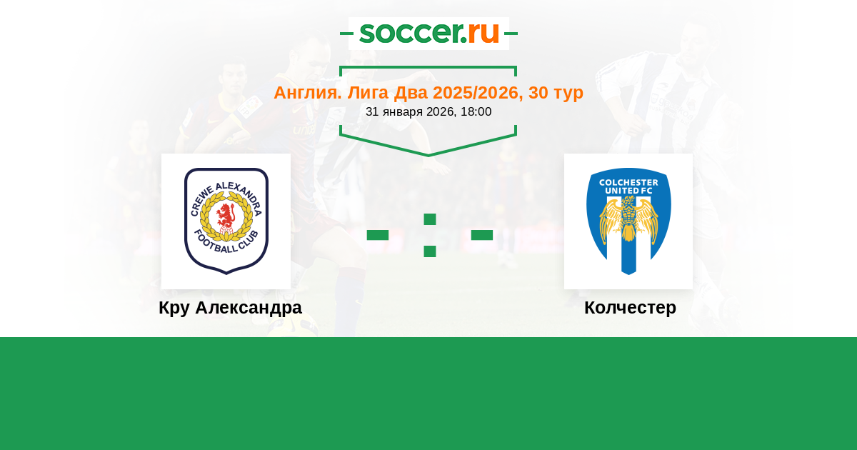 Англия. Вторая Футбольная Лига 26.01.2019 Кру Александра Логотип футбольный клуб Кру Александра 2:1 Логотип футбольный клуб Колчестер Колчестер