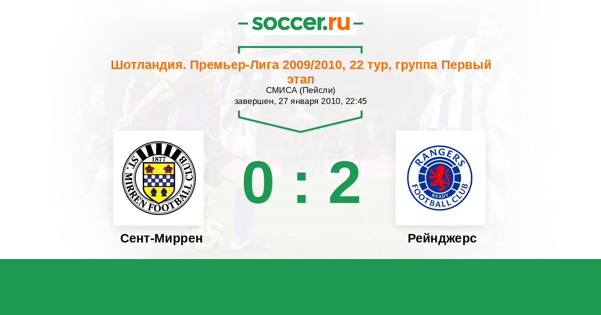 Шотландия. Премьер-Лига 06.03.2010 Рейнджерс Логотип футбольный клуб Рейнджерс (Глазго) 3:1 Логотип футбольный клуб Сент-Миррен (Пейсли) Сент-Миррен