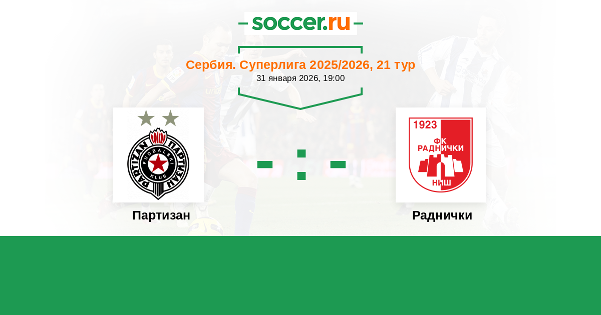 Сербия. Суперлига 12.02.2022 Раднички Логотип футбольный клуб Раднички (Ниш) 0:2 Логотип футбольный клуб Партизан (Белград) Партизан