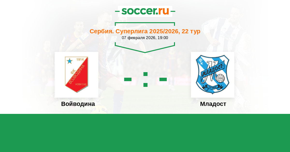Сербия. Суперлига 10.02.2024 Войводина Логотип футбольный клуб Войводина (Нови Сад) 1:1 Логотип футбольный клуб Младост (Лучани) Младост