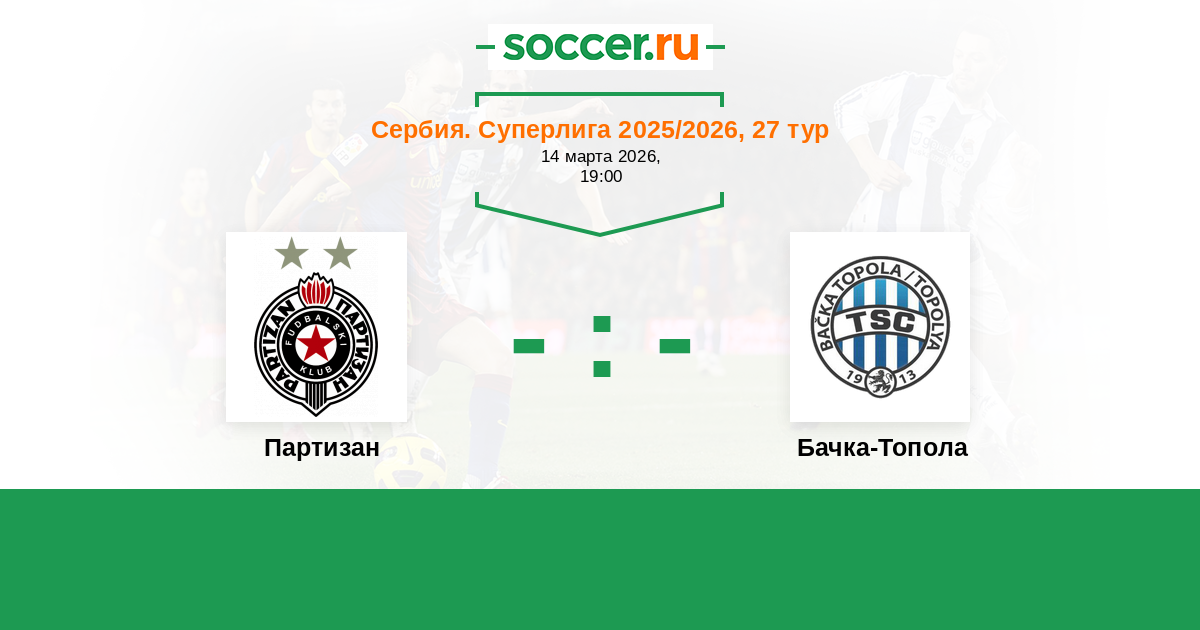 Сербия. Суперлига 29.03.2025 Партизан Логотип футбольный клуб Партизан (Белград) 0:0 Логотип футбольный клуб Бачка-Топола Бачка-Топола