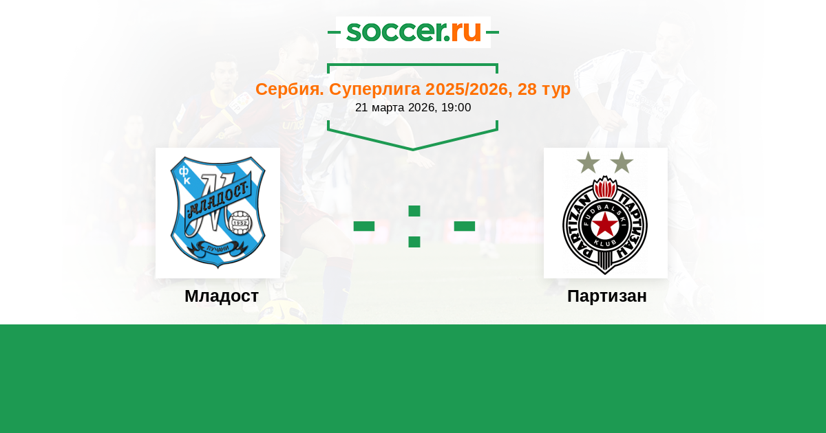 Сербия. Суперлига 03.03.2022 Партизан Логотип футбольный клуб Партизан (Белград) 2:1 Логотип футбольный клуб Младост (Лучани) Младост