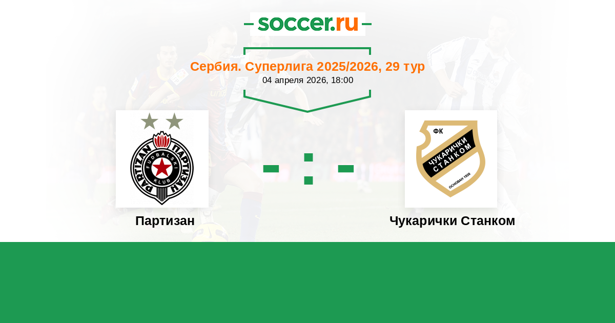 Сербия. Суперлига 20.04.2022 Партизан Логотип футбольный клуб Партизан (Белград) 3:1 Логотип футбольный клуб Чукарички Станком (Белград) Чукарички Станком