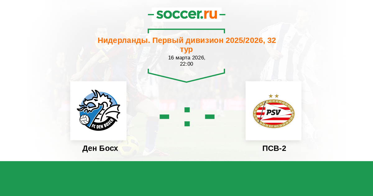 Нидерланды. Первый дивизион 11.04.2016 ПСВ-2 Логотип футбольный клуб ПСВ-2 (Эйндховен) 2:1 Логотип футбольный клуб Ден Босх (Хертогенбос) Ден Босх