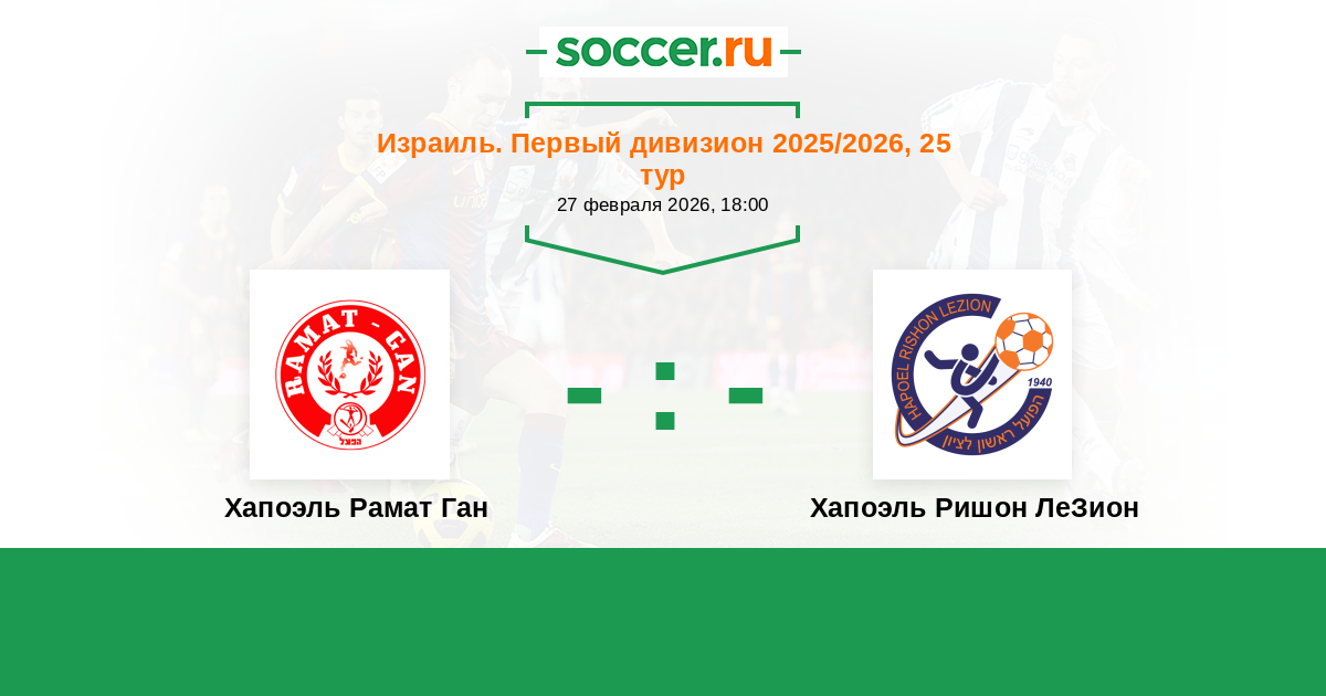 Израиль. Первый дивизион 26.02.2016 Хапоэль Ришон ЛеЗион Логотип футбольный клуб Хапоэль Ришон ЛеЗион 1:1 Логотип футбольный клуб Хапоэль Рамат Ган Хапоэль Рамат Ган