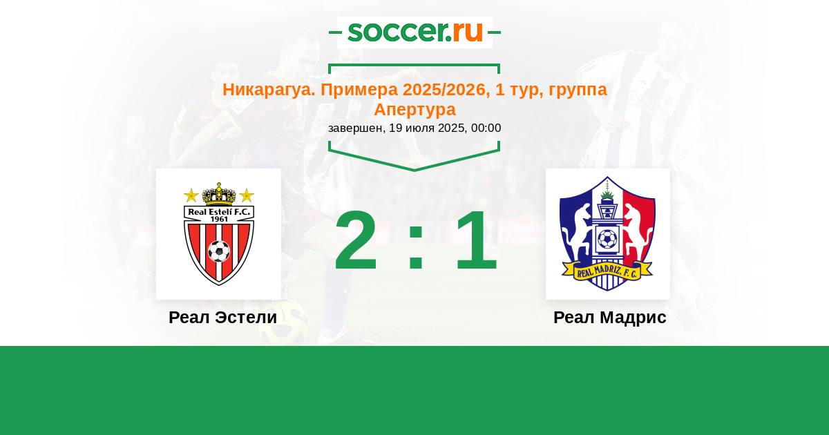 Никарагуа. Примера 28.07.2019 Реал Эстели Логотип футбольный клуб Реал Эстели 1:1 Логотип футбольный клуб Реал Мадрис (Сомото) Реал Мадрис