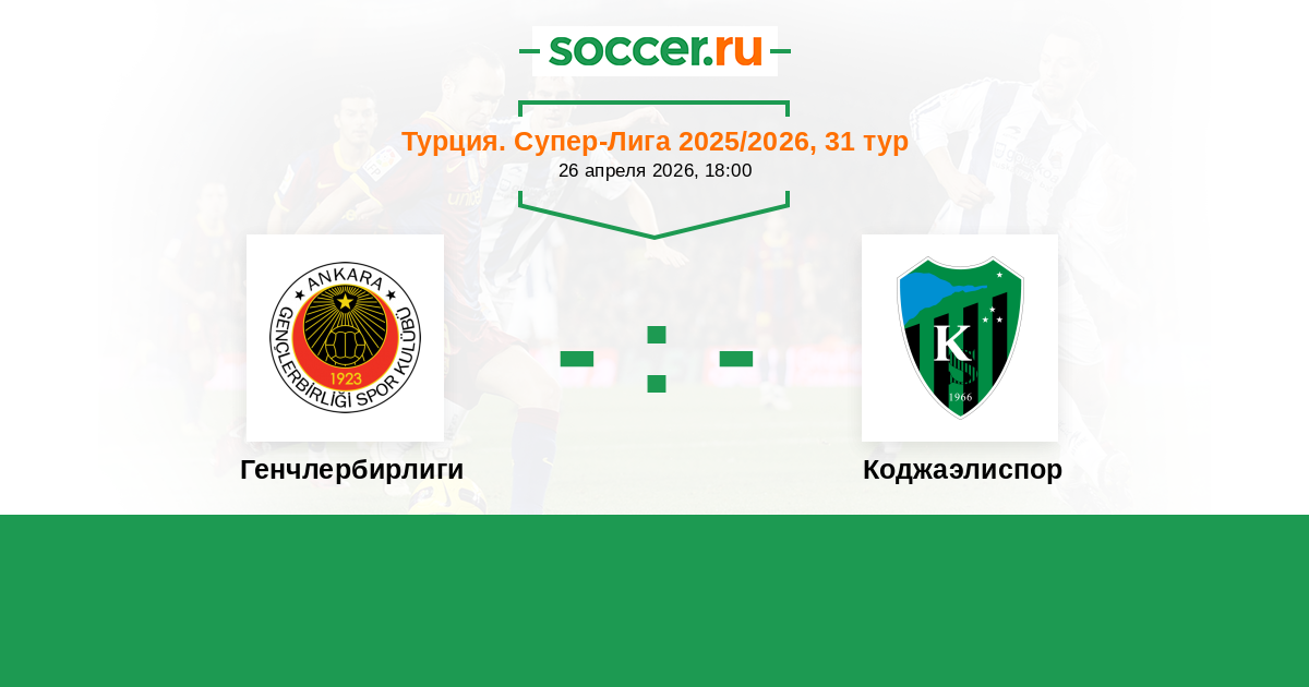 Турция. Суперлига 28.11.2025 Коджаэлиспор Логотип футбольный клуб Коджаэлиспор 1:0 Логотип футбольный клуб Генчлербирлиги (Анкара) Генчлербирлиги