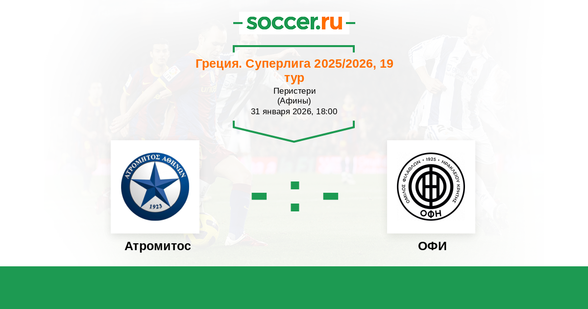 Греция. Суперлига 10.01.2021 Атромитос Логотип футбольный клуб Атромитос (Перистери) 0:0 Логотип футбольный клуб ОФИ (Ираклион) ОФИ