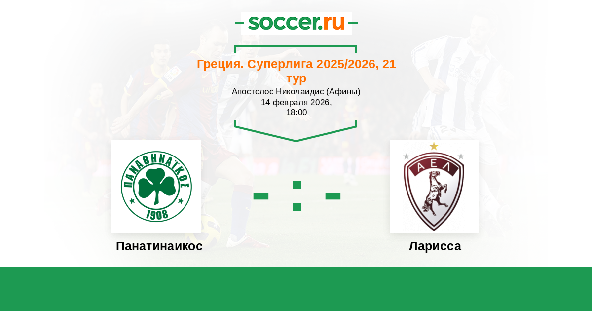 Греция. Суперлига 25.01.2020 Ларисса Логотип футбольный клуб Ларисса 0:2 Логотип футбольный клуб Панатинаикос (Афины) Панатинаикос