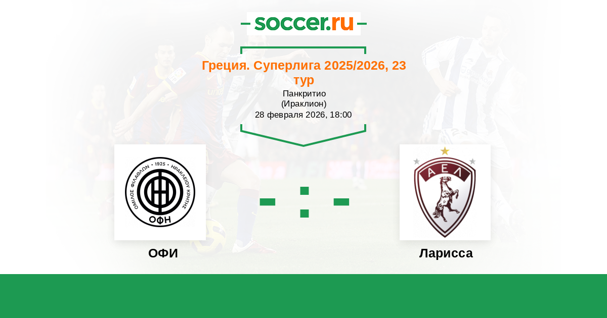 Греция. Суперлига 24.11.2025 Ларисса Логотип футбольный клуб Ларисса 1:2 Логотип футбольный клуб ОФИ (Ираклион) ОФИ