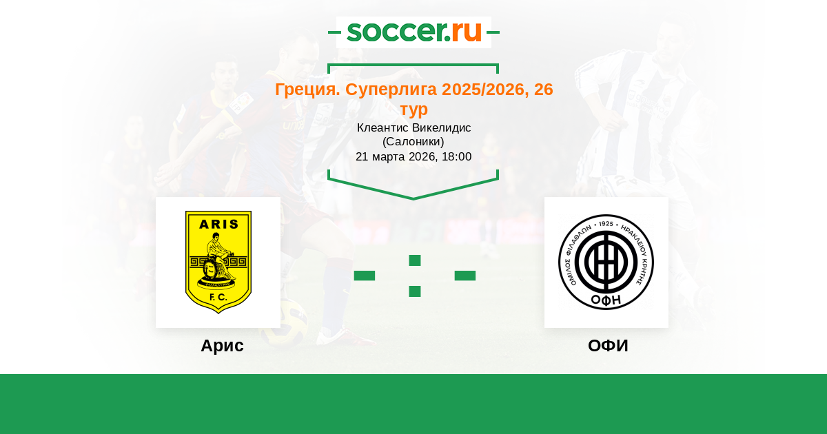 Греция. Суперлига 05.04.2025 Арис Логотип футбольный клуб Арис (Салоники) 2:0 Логотип футбольный клуб ОФИ (Ираклион) ОФИ