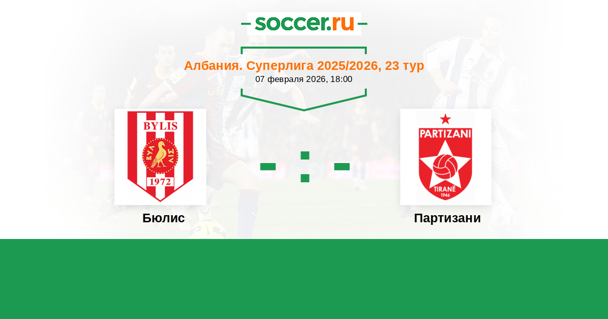 Албания. Суперлига 21.02.2025 Партизани Логотип футбольный клуб Партизани (Тирана) 2:3 Логотип футбольный клуб Бюлис (Баллш) Бюлис