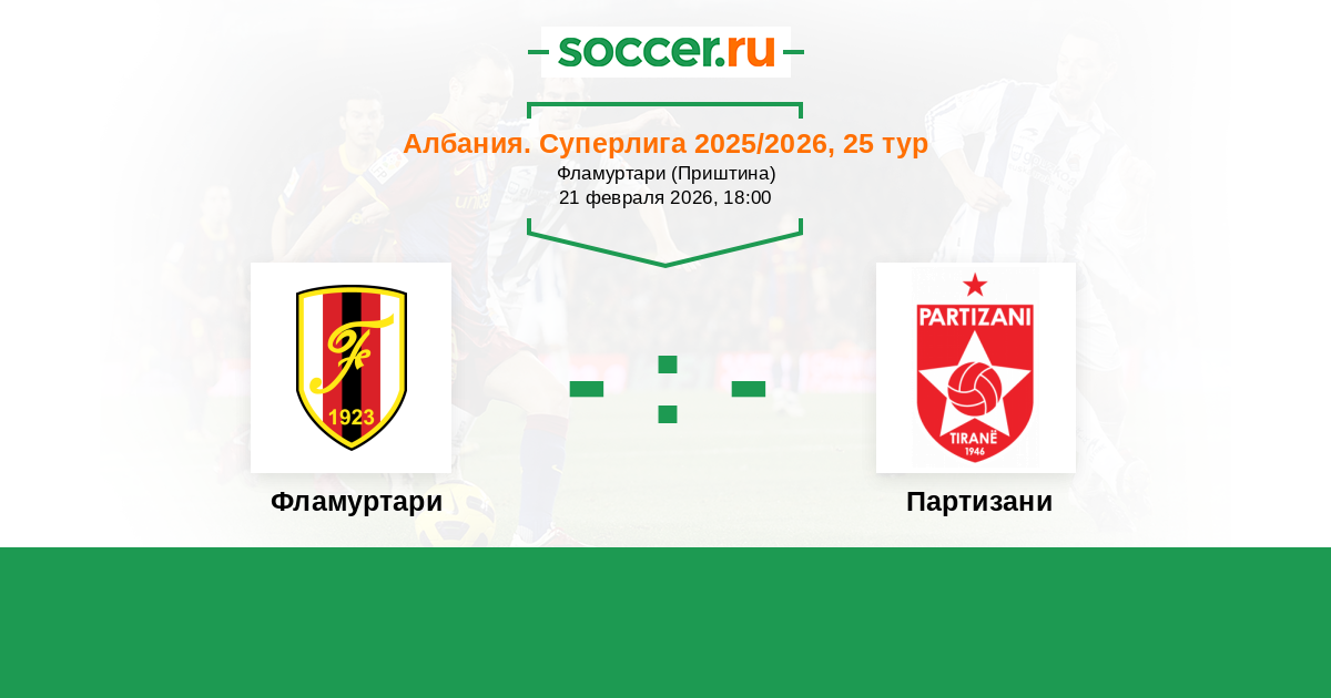 Албания. Суперлига 06.02.2016 Партизани Логотип футбольный клуб Партизани (Тирана) 1:1 Логотип футбольный клуб Фламуртари (Влера) Фламуртари