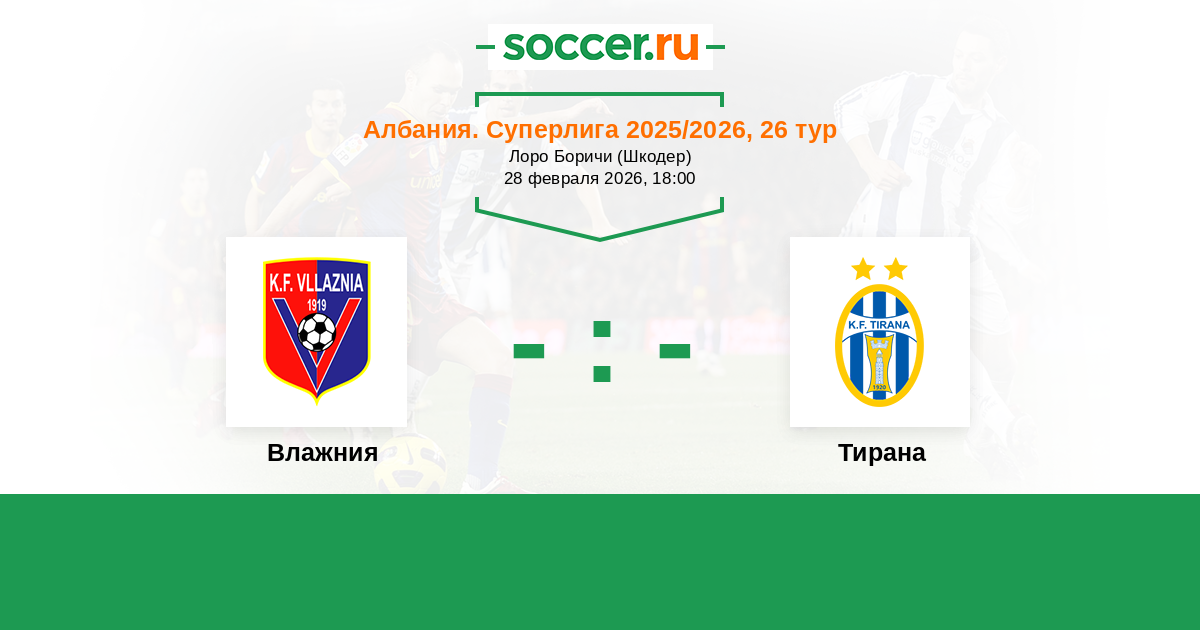 Албания. Суперлига 11.09.2014 Влажния Логотип футбольный клуб Влажния (Шкодер) 1:1 Логотип футбольный клуб Тирана Тирана