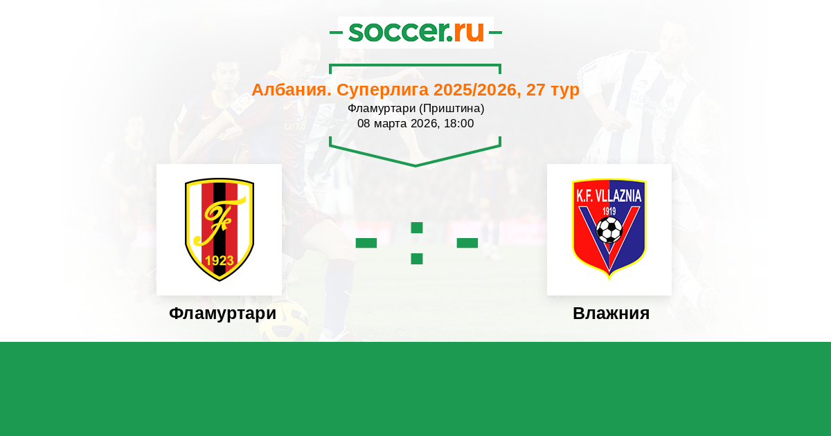 Албания. Суперлига 05.03.2018 Влажния Логотип футбольный клуб Влажния (Шкодер) 3:0 Логотип футбольный клуб Фламуртари (Влера) Фламуртари