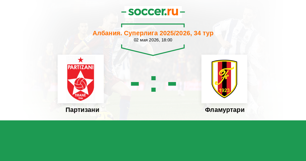 Албания. Суперлига 30.03.2014 Фламуртари Логотип футбольный клуб Фламуртари (Влера) 0:0 Логотип футбольный клуб Партизани (Тирана) Партизани