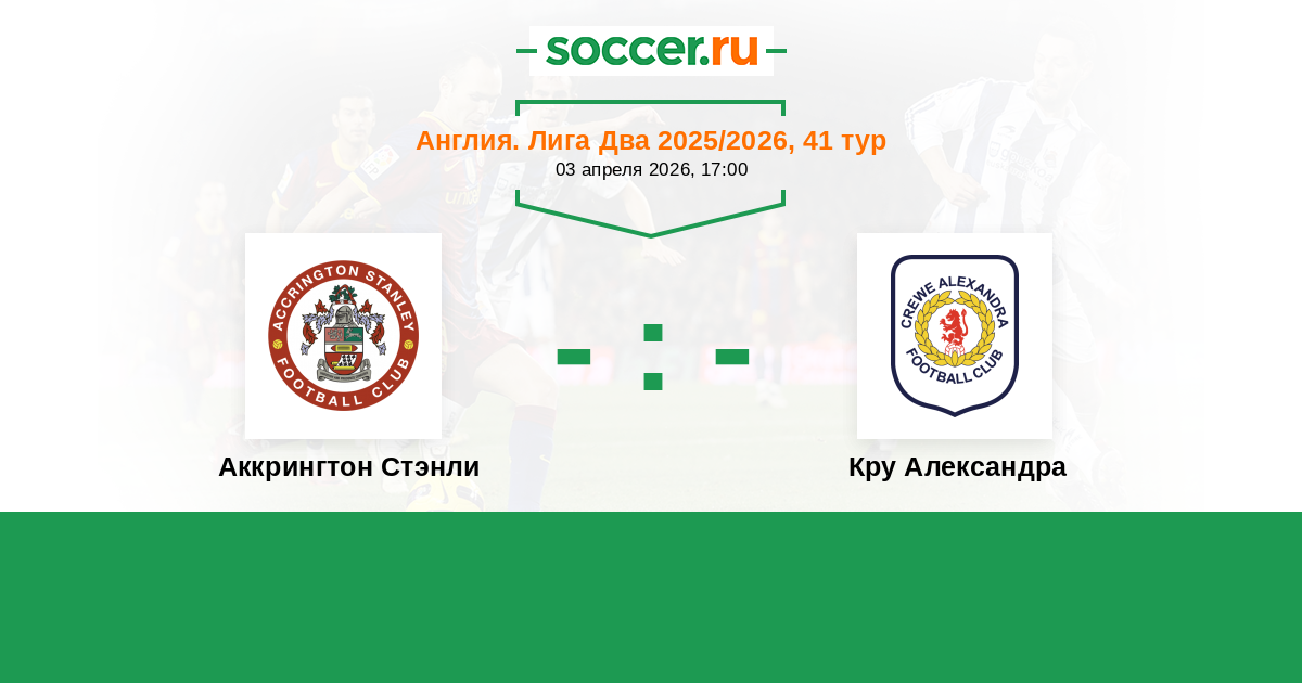 Англия. Вторая Футбольная Лига 06.04.2024 Аккрингтон Стэнли Логотип футбольный клуб Аккрингтон Стэнли 0:0 Логотип футбольный клуб Кру Александра Кру Александра