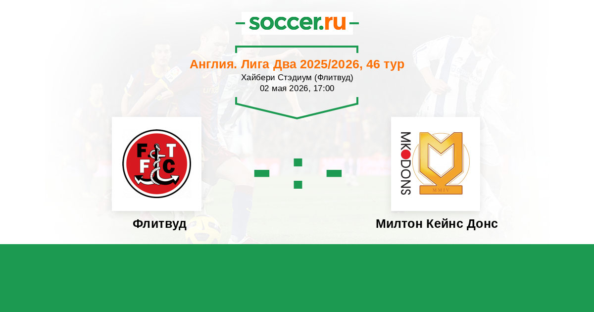Англия. Первая Футбольная Лига 22.04.2023 Флитвуд Логотип футбольный клуб Флитвуд 1:0 Логотип футбольный клуб Милтон Кейнс Донс Милтон Кейнс Донс