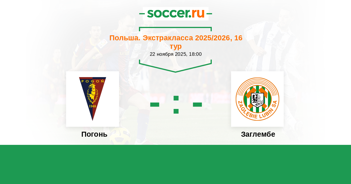 Польша. Экстракласса 10.12.2017 Погонь Логотип футбольный клуб Погонь (Щецин) 3:3 Логотип футбольный клуб Заглембе (Любина) Заглембе