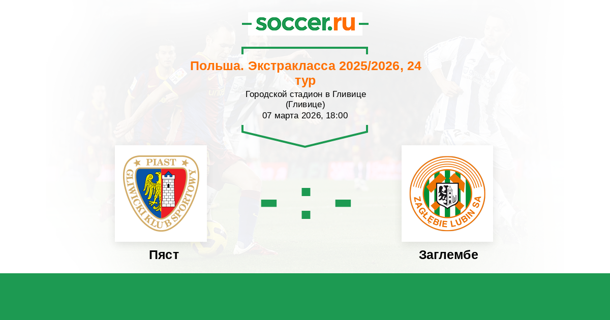 Польша. Экстракласса 16.03.2018 Пяст Логотип футбольный клуб Пяст (Гливице) 0:0 Логотип футбольный клуб Заглембе (Любина) Заглембе