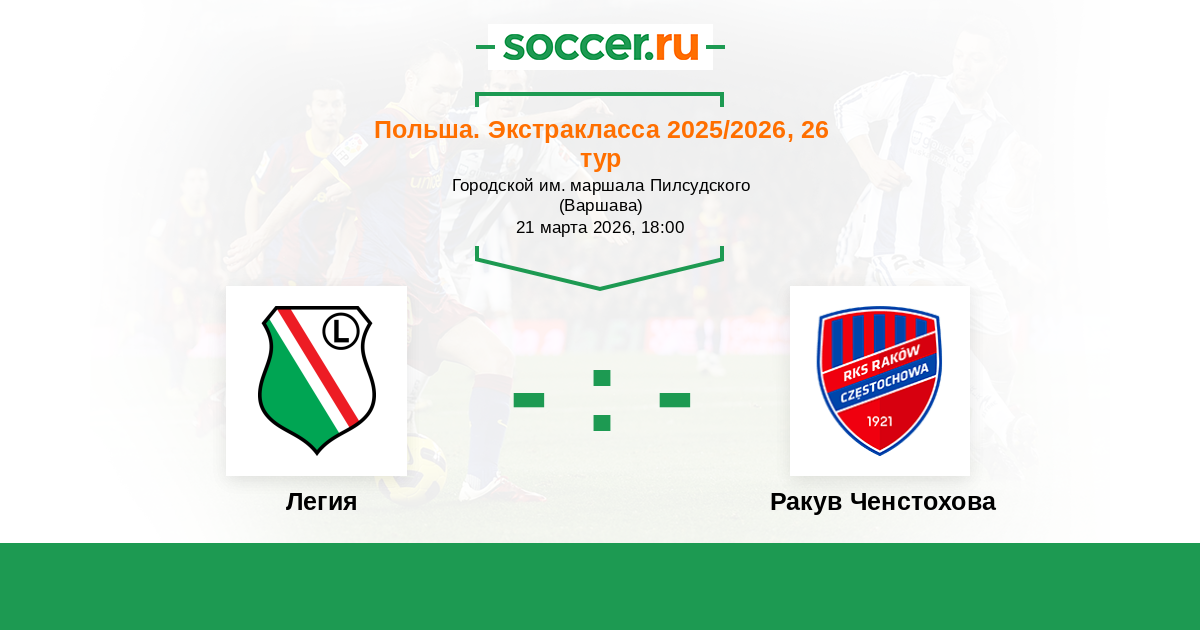 Польша. Экстракласса 16.03.2025 Ракув Ченстохова Логотип футбольный клуб Ракув Ченстохова 3:2 Логотип футбольный клуб Легия (Варшава) Легия