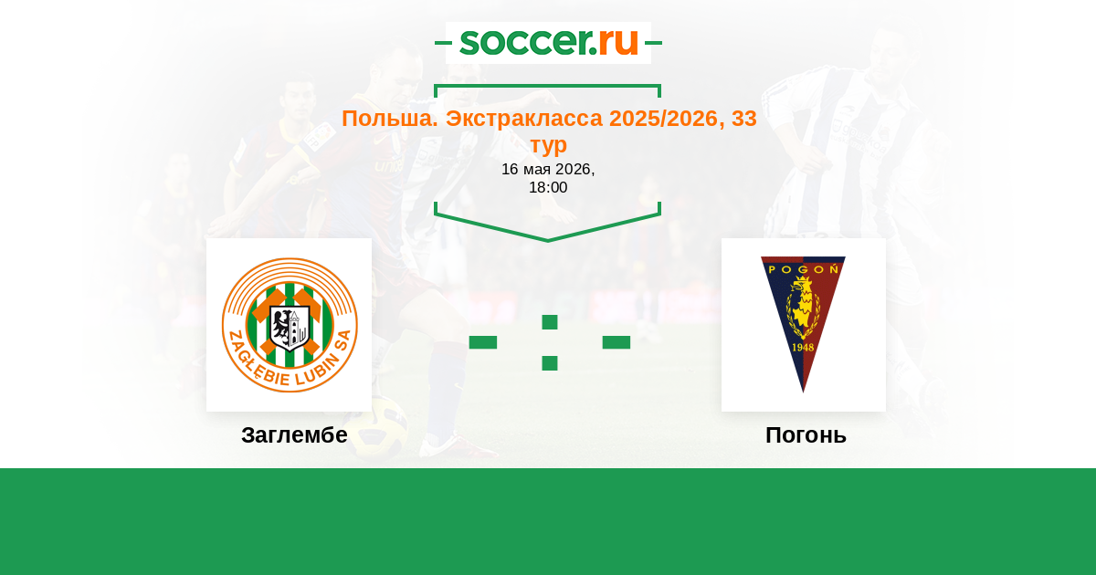 Польша. Экстракласса 29.05.2020 Погонь Логотип футбольный клуб Погонь (Щецин) 0:3 Логотип футбольный клуб Заглембе (Любина) Заглембе