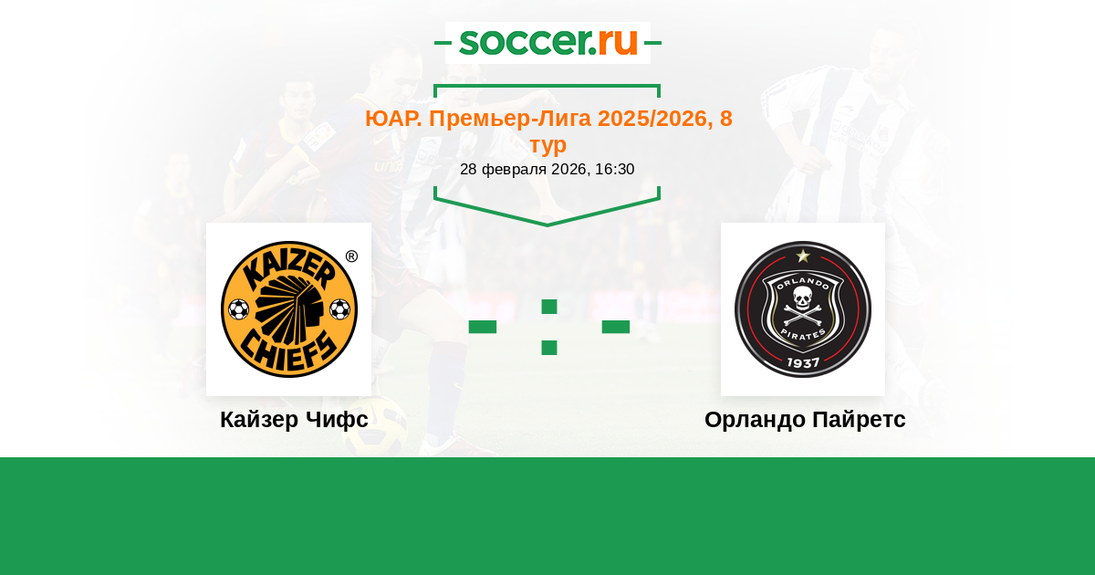 ЮАР. Премьер-Лига 05.03.2022 Орландо Пайретс Логотип футбольный клуб Орландо Пайретс (Йоханнесбург) 1:2 Логотип футбольный клуб Кайзер Чифс (Йоханнесбург) Кайзер Чифс