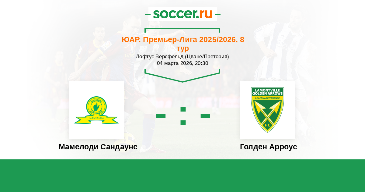 ЮАР. Премьер-Лига 05.03.2025 Голден Арроус Логотип футбольный клуб Голден Арроус (Дурбан) 1:1 Логотип футбольный клуб Мамелоди Сандаунс (Претория) Мамелоди Сандаунс