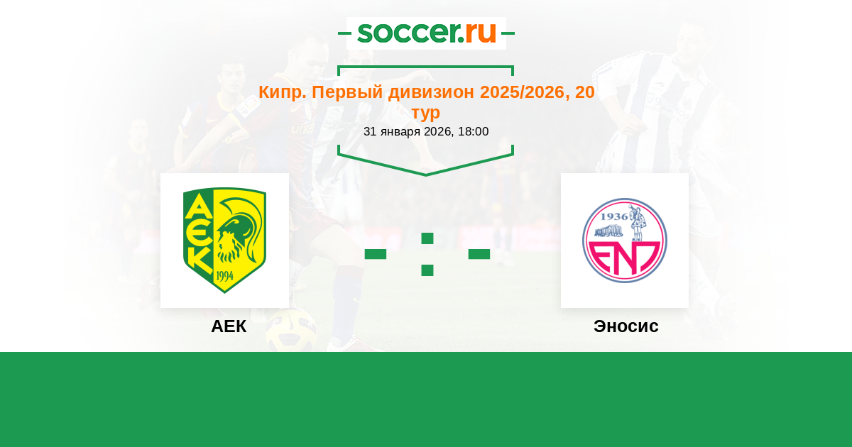 Кипр. Первый Дивизион 10.01.2021 АЕК Логотип футбольный клуб АЕК (Ларнака) 1:2 Логотип футбольный клуб Эносис (Паралимни) Эносис