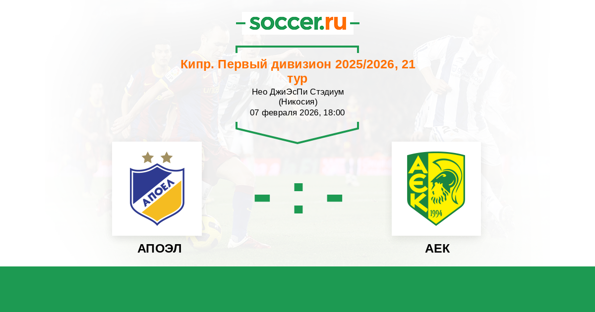 Кипр. Первый Дивизион 14.02.2022 АПОЭЛ Логотип футбольный клуб АПОЭЛ (Никосия) 1:0 Логотип футбольный клуб АЕК (Ларнака) АЕК