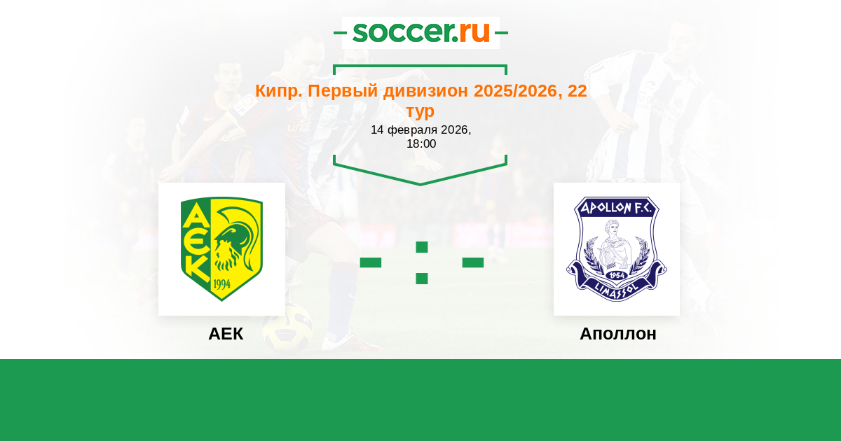 Кипр. Первый Дивизион 11.02.2018 Аполлон Логотип футбольный клуб Аполлон (Лимассол) 2:0 Логотип футбольный клуб АЕК (Ларнака) АЕК