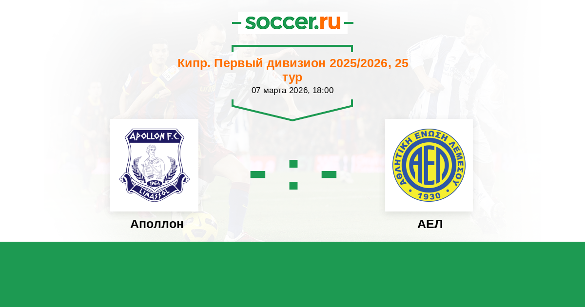 Кипр. Первый Дивизион 03.03.2018 Аполлон Логотип футбольный клуб Аполлон (Лимассол) 5:1 Логотип футбольный клуб АЕЛ (Лимасcол) АЕЛ