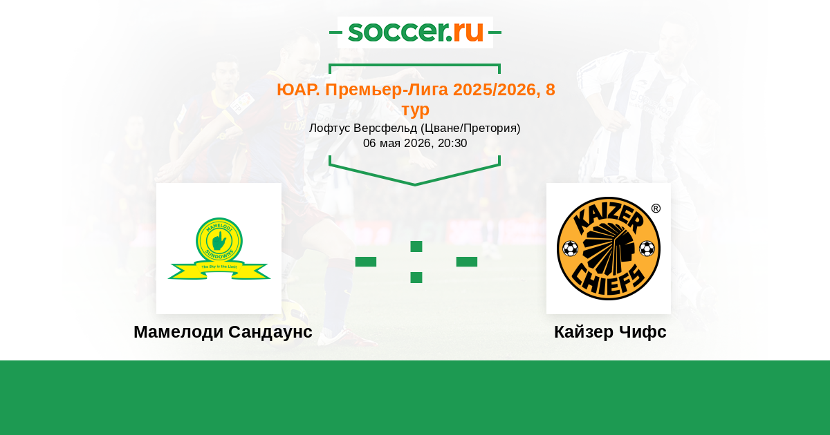ЮАР. Премьер-Лига 08.05.2022 Кайзер Чифс Логотип футбольный клуб Кайзер Чифс (Йоханнесбург) 1:1 Логотип футбольный клуб Мамелоди Сандаунс (Претория) Мамелоди Сандаунс