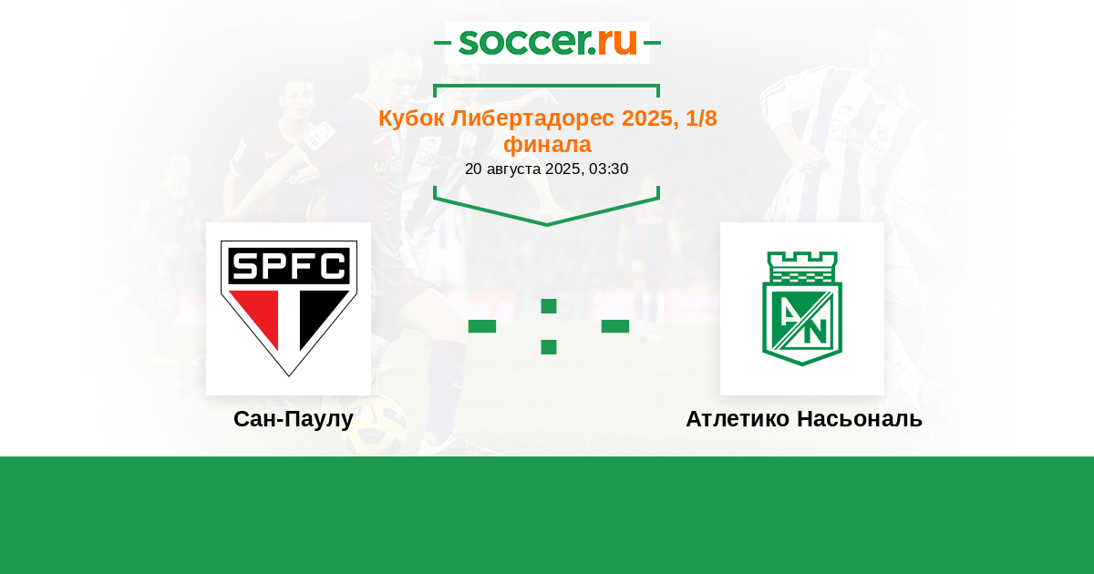 Сан - Паулу - Атлетико Насьональ ! Последнюю встречу эти команды закончили нулевой ничьей . Вряд ли за такой короткий промежуток времени у этих команд кардинально изменится подход к данному матчу . ТМ.
