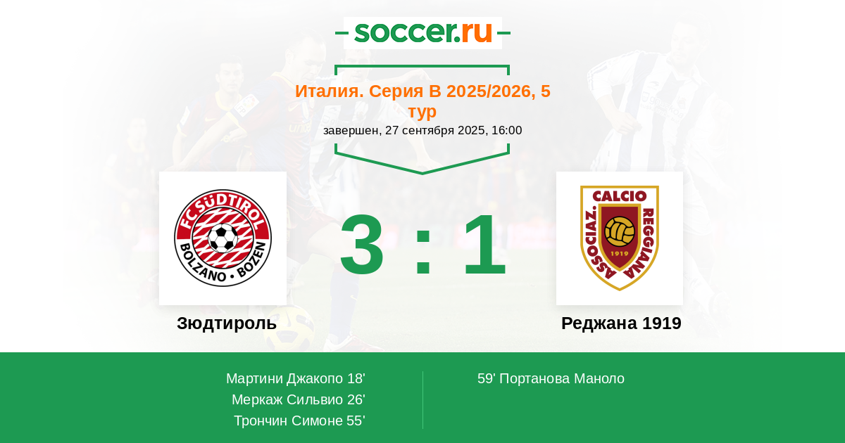 59' (3:1) Портанова Маноло (90) (Бертаньоли Массимо (26))