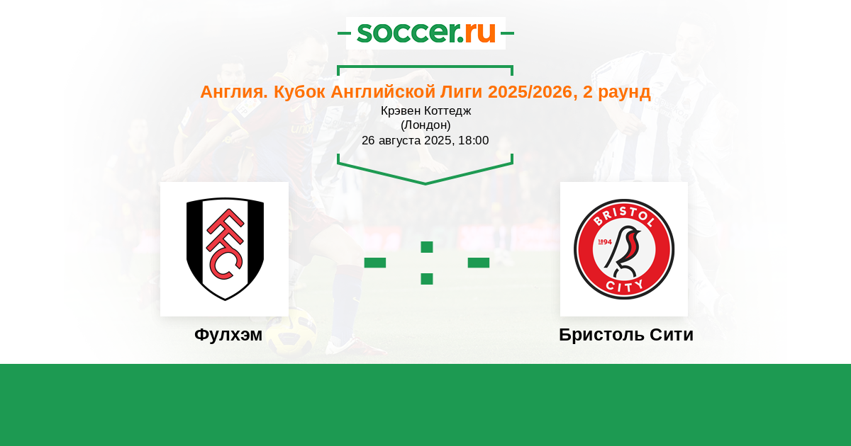 Фулхэм - Бристоль Сити ! Безусловный фаворит этого матча конечно же " Дачники " . Но это кубковое противостояние в Англии - поэтому предположу борьбу и по крайней мере обмен голами.