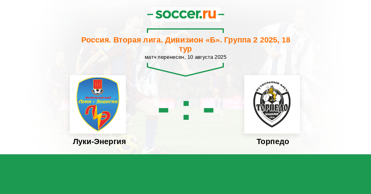 Россия. Вторая лига. Группа 2 10.08.2018 Торпедо Логотип футбольный клуб Торпедо (Владимир) 0:0 Логотип футбольный клуб Луки-Энергия (Великие Луки) Луки-Энергия