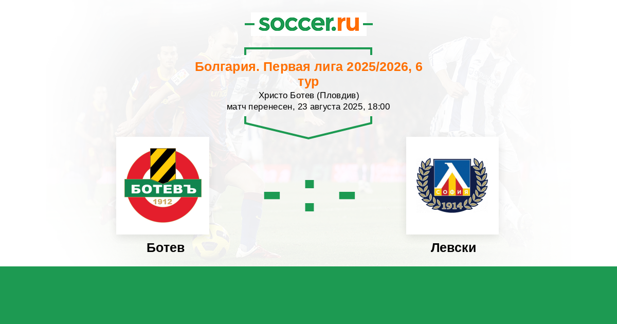 Болгария. Первая лига 20.08.2021 Ботев Логотип футбольный клуб Ботев (Пловдив) 3:1 Логотип футбольный клуб Левски (София) Левски